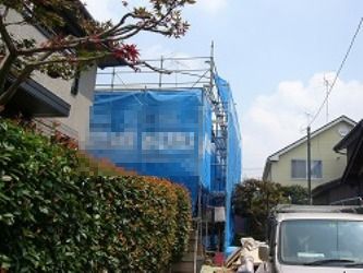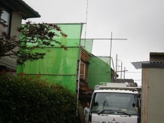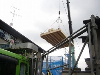沼田工場から大型ダンプ5台で運んできた。ガードマン2人が保安に | 立っていよいよクレーン車で本体を橋爪さんの屋根のはるか上から 本体を1つずつ下ろして総勢15人で組み立て。手際が良く本当に 感動。夕方には形が出来上がった。 |